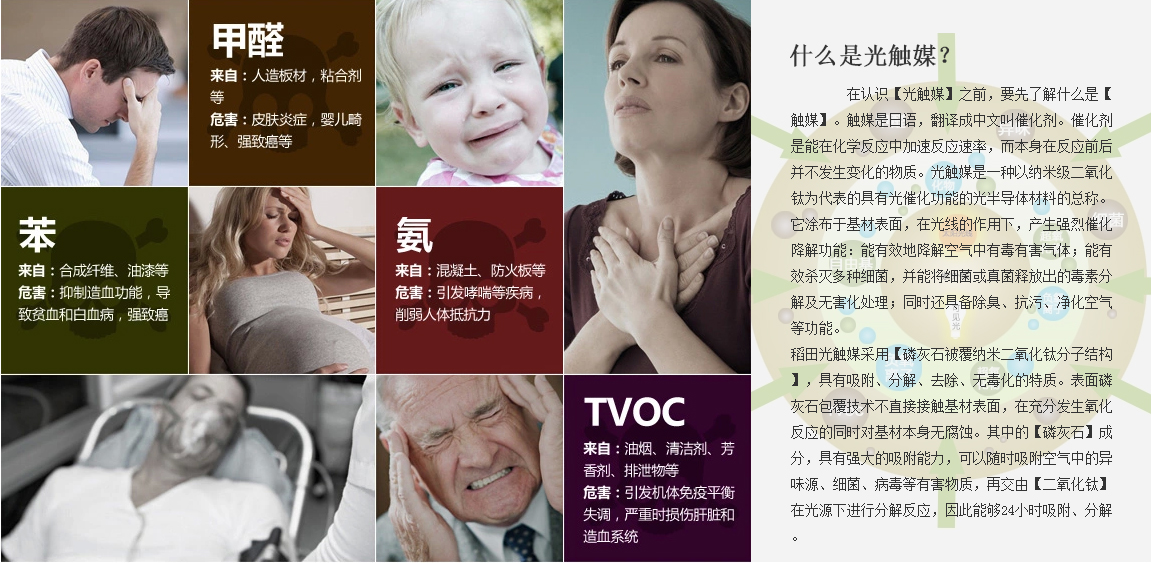 在認識【光觸媒】之前,要先了解什么是【觸媒】。觸媒是日語,翻譯成中文叫催化劑。催化劑是能在化學(xué)反應(yīng)中加速反應(yīng)速率,而本身在反應(yīng)前后并不發(fā)生變化的物質(zhì)。光觸媒是一種以納米級二氧化鈦為代表的具有光催化功能的光半導(dǎo)體材料的總稱。它涂布于基材表面,在光線的作用下,產(chǎn)生強烈催化降解功能:能有效地降解空氣中有毒有害氣體;能有效殺滅多種細菌,并能將細菌或真菌釋放出的毒素分解及無害化處理;同時還具備除臭、抗污、凈化空氣等功能。 稻田光觸媒采用【磷灰石被覆納米二氧化鈦分子結(jié)構(gòu)】,具有吸附、分解、去除、無毒化的特質(zhì)。表面磷灰石包覆技術(shù)不直接接觸基材表面,在充分發(fā)生氧化反應(yīng)的同時對基材本身無腐蝕。其中的【磷灰石】成分,具有強大的吸附能力,可以隨時吸附空氣中的異味源、細菌、病毒等有害物質(zhì),再交由【二氧化鈦】在光源下進行分解反應(yīng),因此能夠24小時吸附、分解